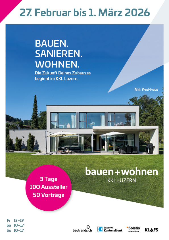 Vom 27. Februar bis 1. März 2026 wird die Baumesse zum dritten Mal im exklusiven KKL Luzern zum unverzichtbaren Treffpunkt für über 7'000 Besucherinnen und Besucher. Freuen Sie sich während den drei Messetagen auf über 50 kostenlose Fachvorträge, Foren und Beratungsmöglichkeiten in den Bereichen Bauen, Sanieren, Wohnen und Energie.